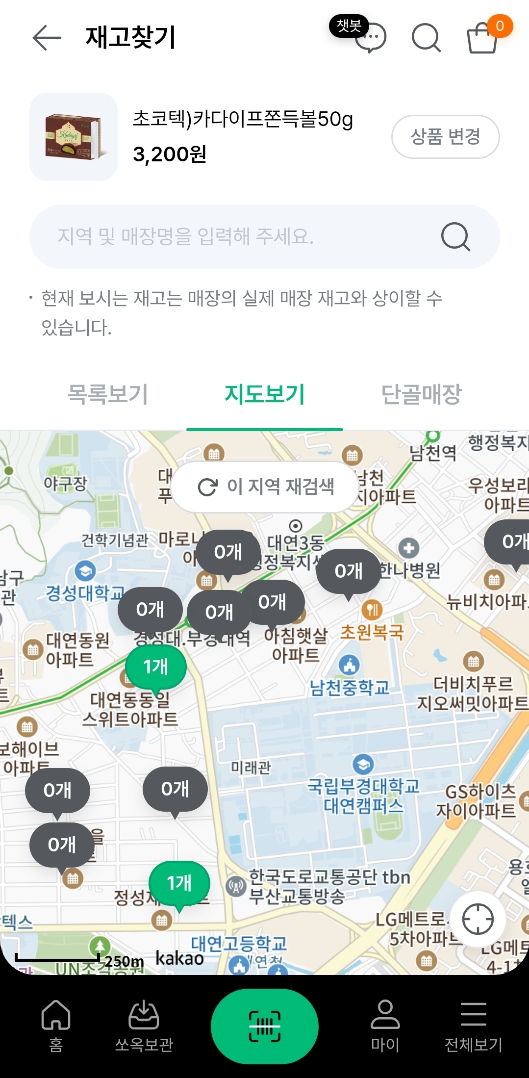 👉 목록보기보다는 지도보기로 지도에서 재고 있는 위치(초록색 표시)를 찾는게 가장 빠르다.
